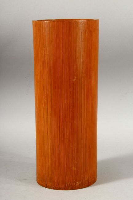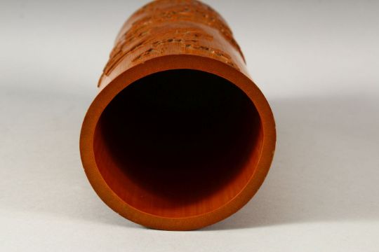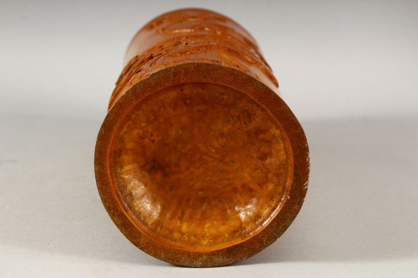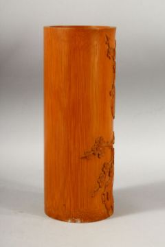 A CHINESE CARVED BAMBOO BRUSH POT - decorated with scenes of birds upon tree branches, 28cm