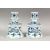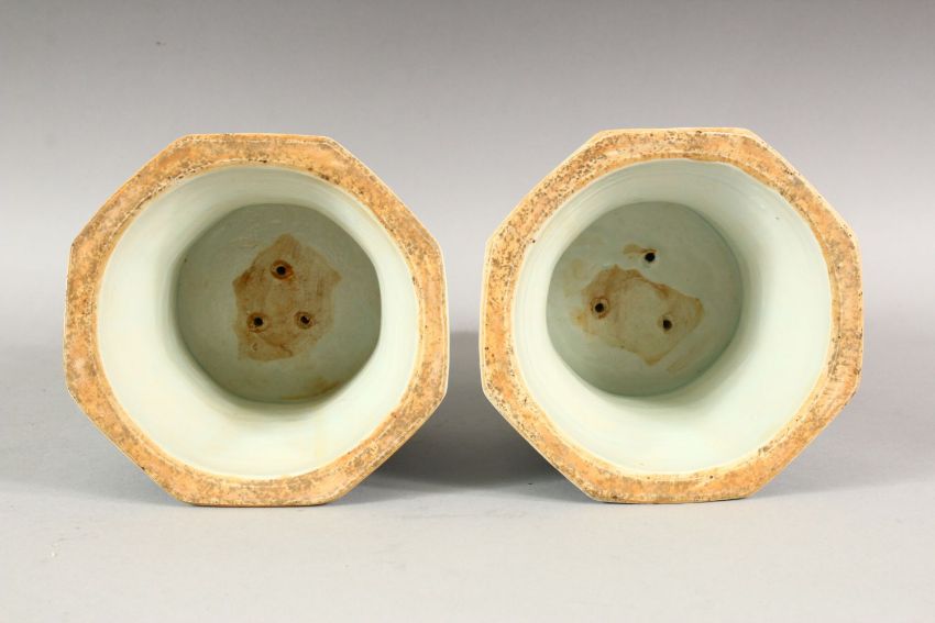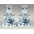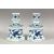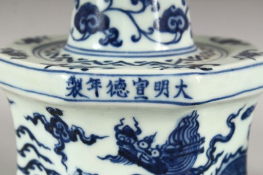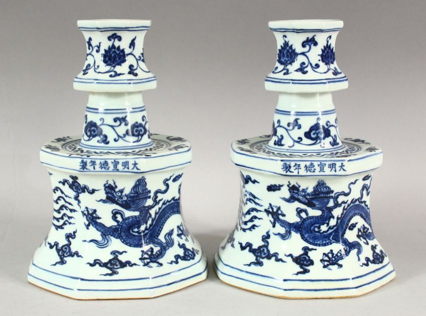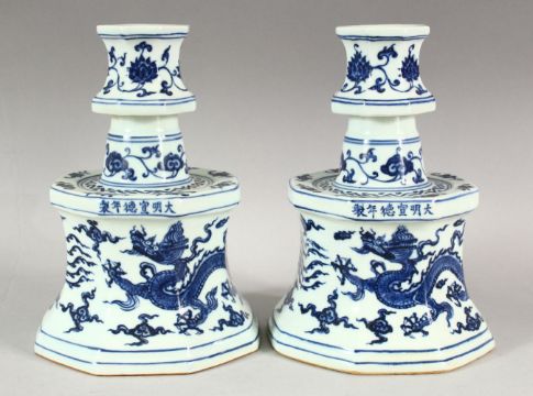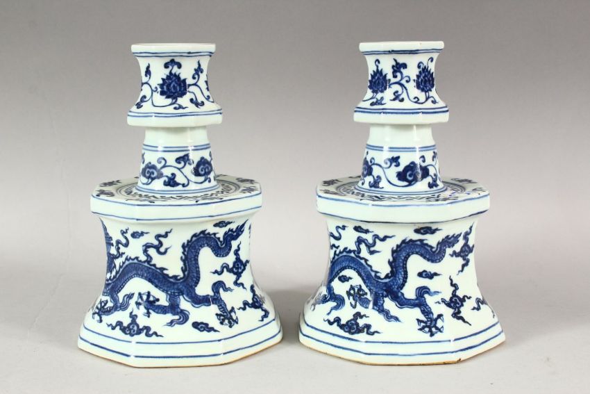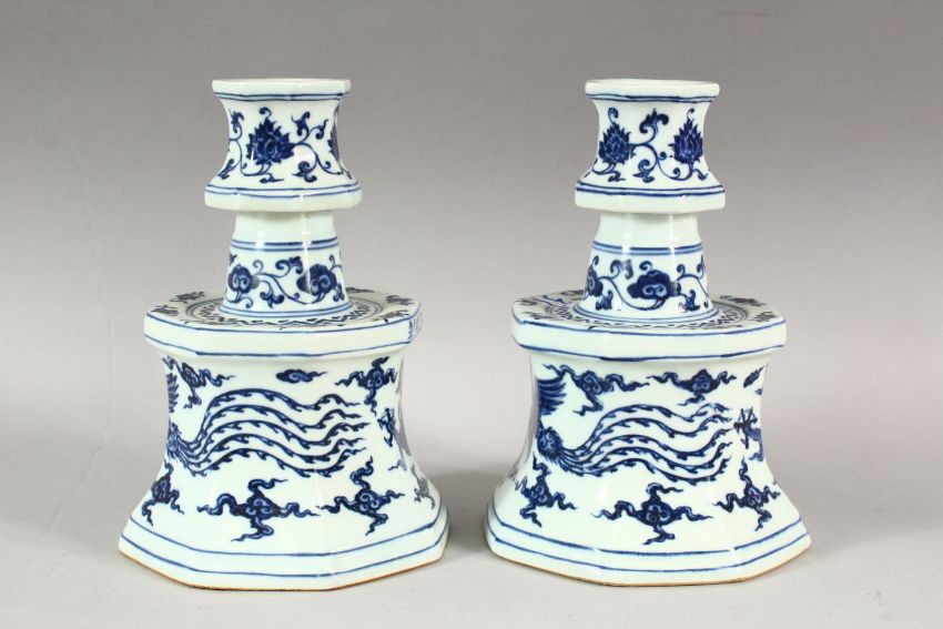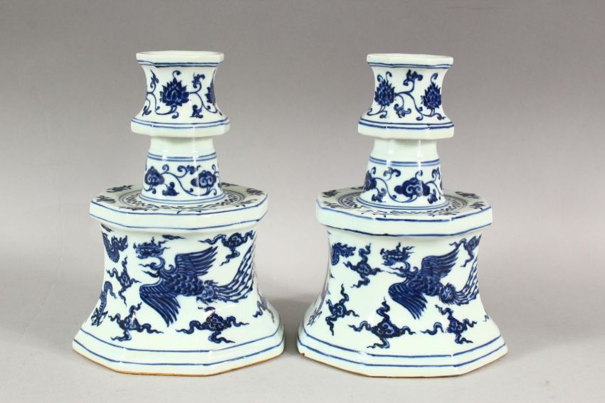 A PAIR OF CHINESE BLUE & WHITE PORCELAIN CANDLESTICKS - each decorated with phoenix and dragons amongst clouds, the sides with a six character mark, 22cm high.