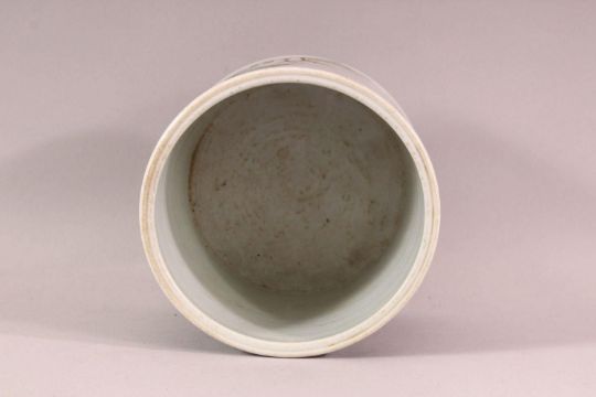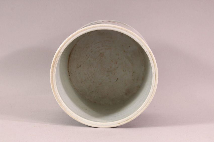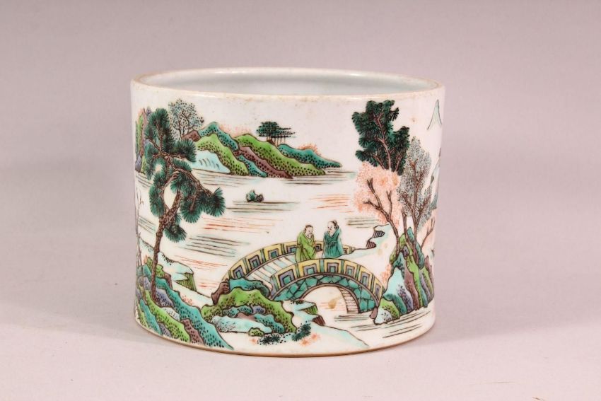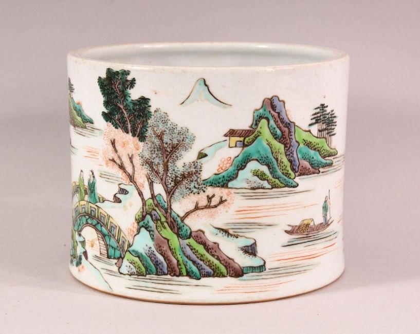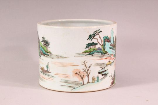 A CHINESE FAMILLE ROSE PORCELAIN BRUSH WASH / POT, depicting figures stood in native waterside landscape settings, 17cm diameter.