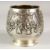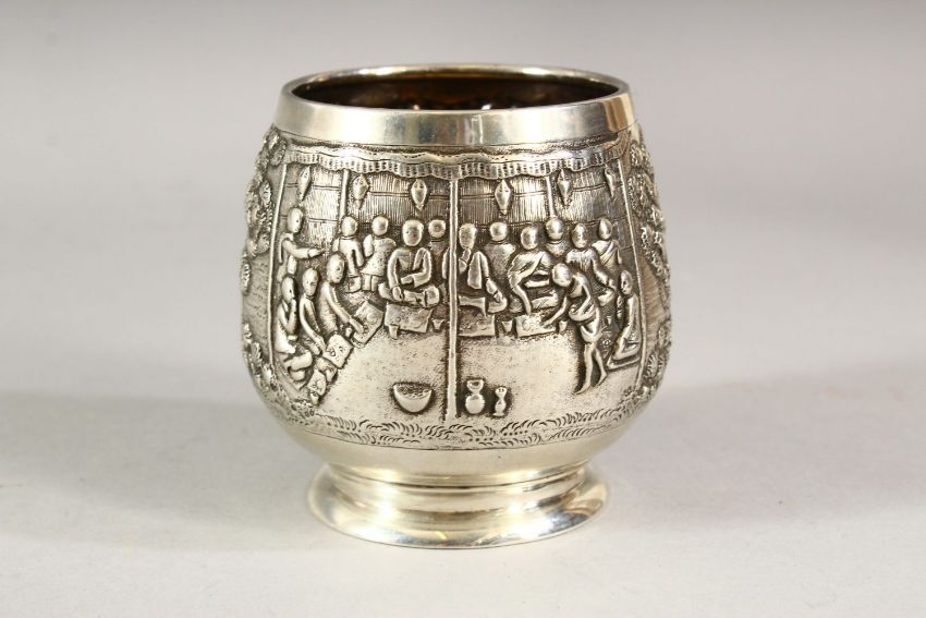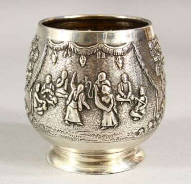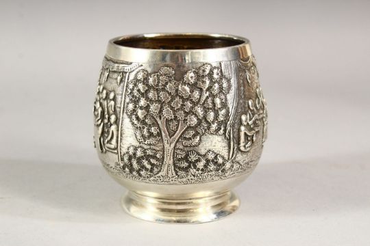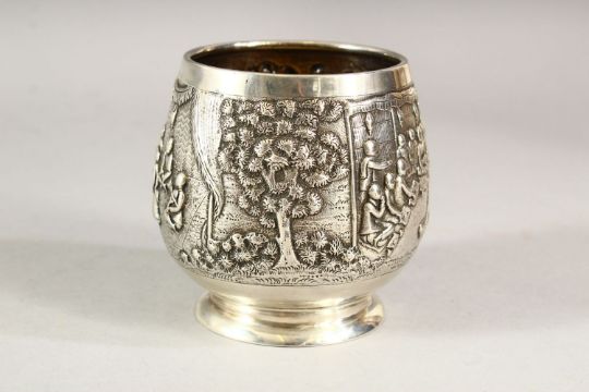 A SMALL EASTERN SILVER PEDESTAL BOWL, embossed decoration depicting figures and trees, 8cm high.