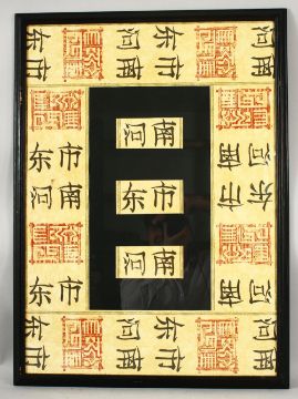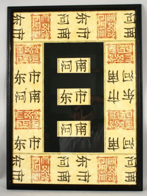 A DECORATIVE CHINESE CALLIGRAPHY SCRIPT PICTURE, image 69cm x 49cm.