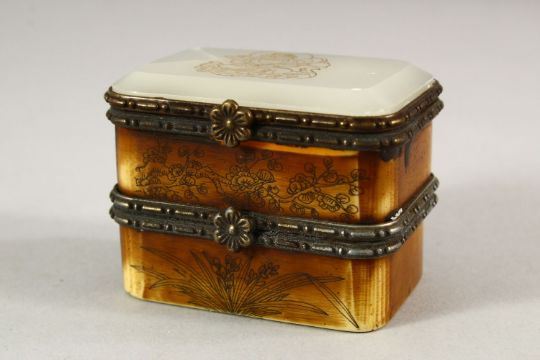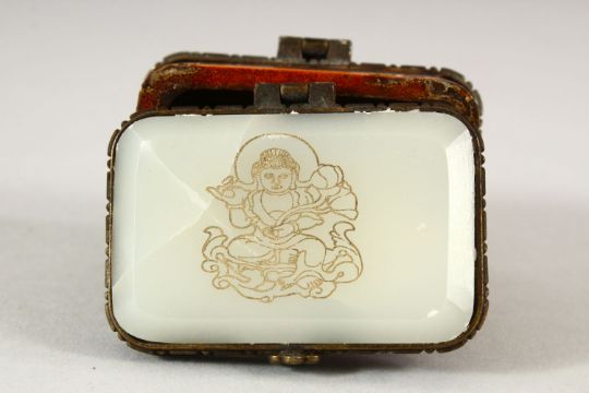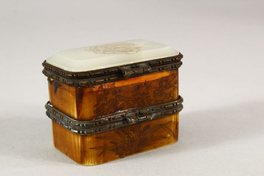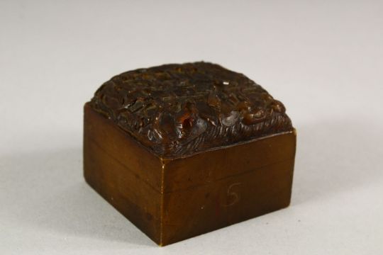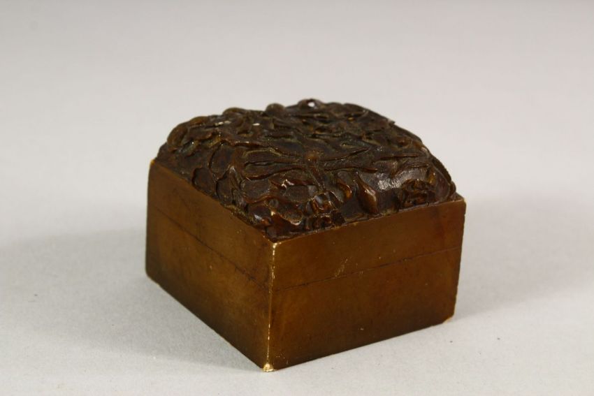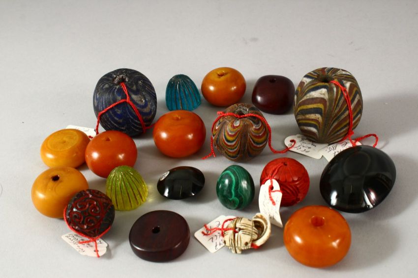 A MIXED LOT OF CHINESE ITEMS - comprising one metal desk seal with dragons and characters, 5cm, one small jade topped twin compartment box, carved with buddha, 6.5cm , also with 19 beads, some stone, bakelite, ivory etc. (21)