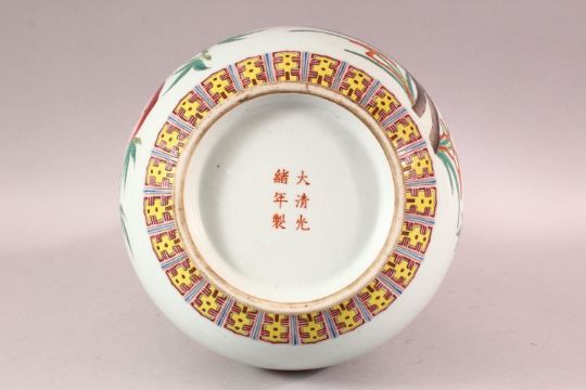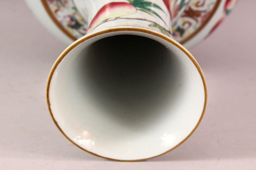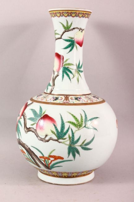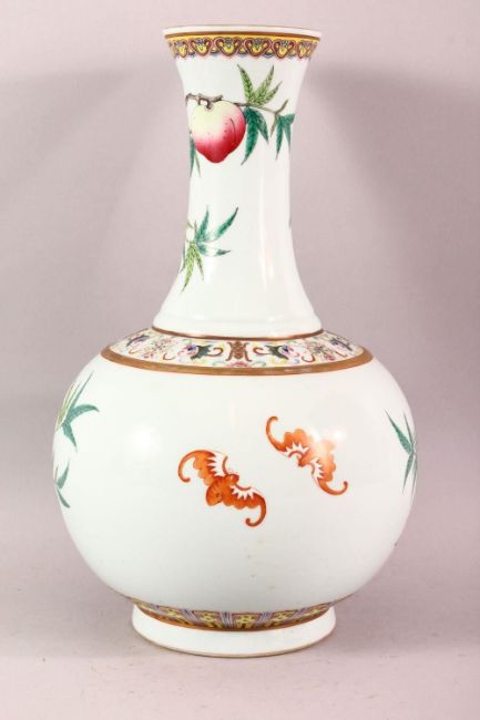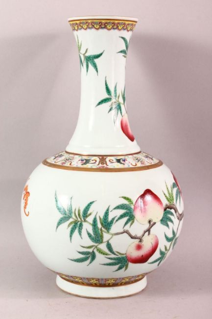 A CHINESE FAMILLE ROSE PORCELAIN PEACH VASE, the body painted with peach blossom and bats, red six character mark to base, 39cm high.