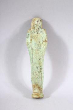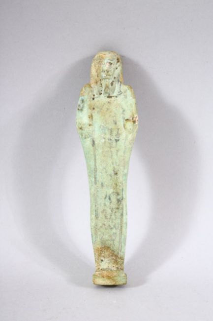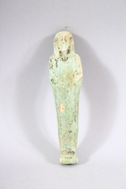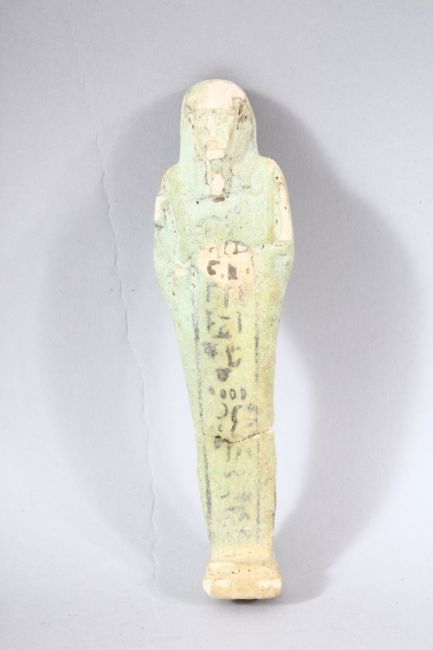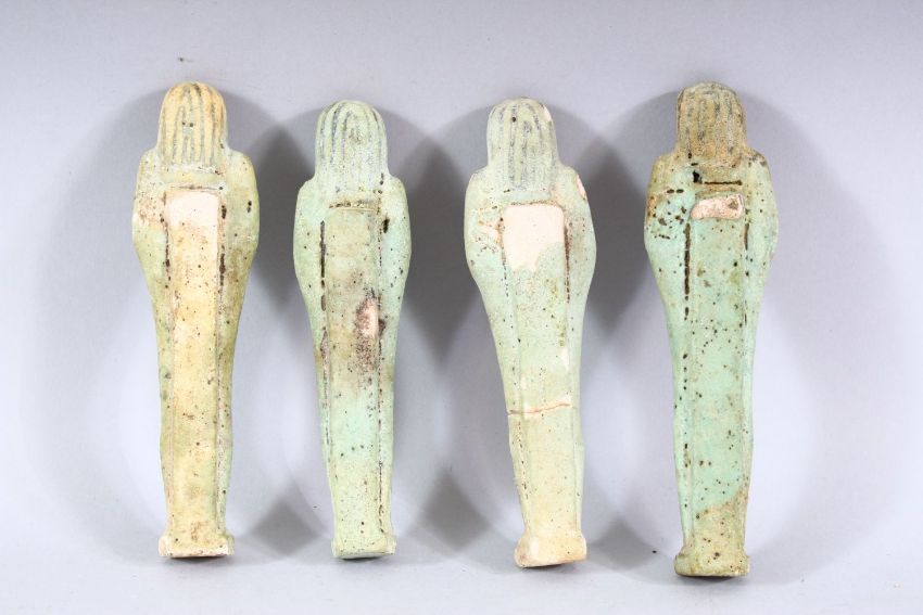A LOT OF FOUR ANCIENT EGYPTIAN POTTERY USHABTI FIGURES - Each with a turquoise glaze and Egyptian archaic scripture, from private UK collection. 16cm
