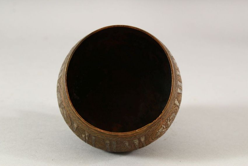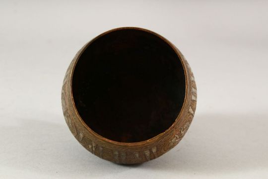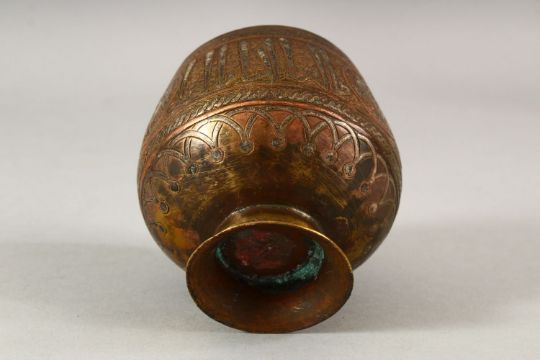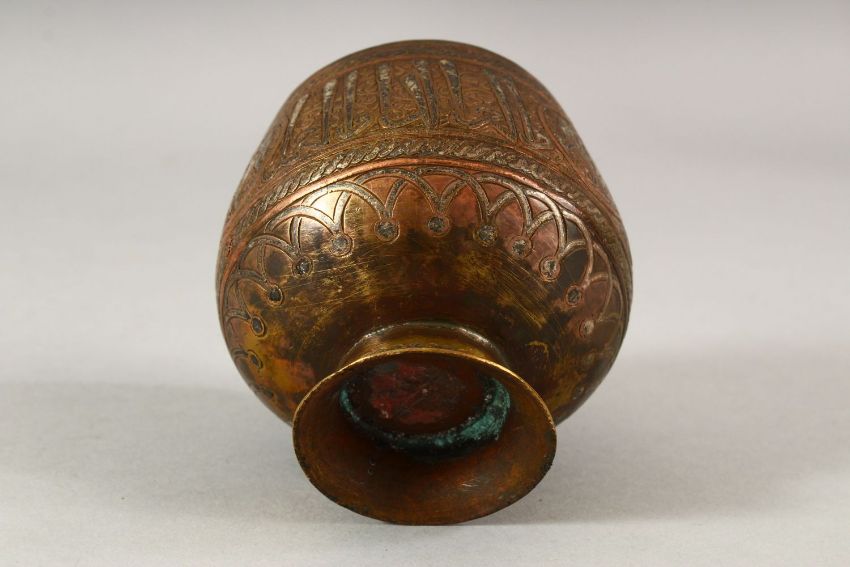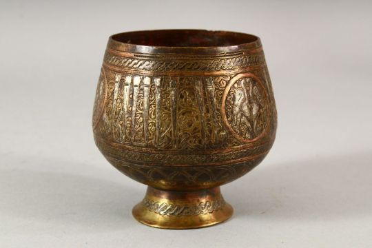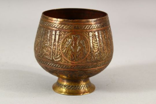A FINE ISLAMIC SILVER INLAID BRASS BEAKER, 8.5cm high.