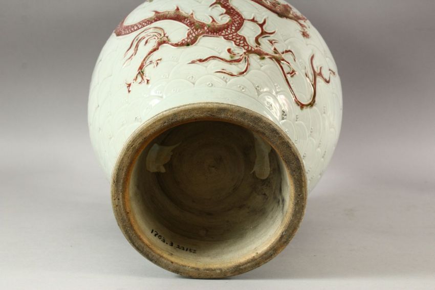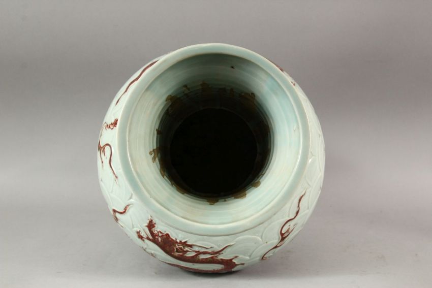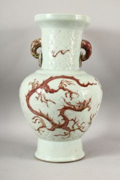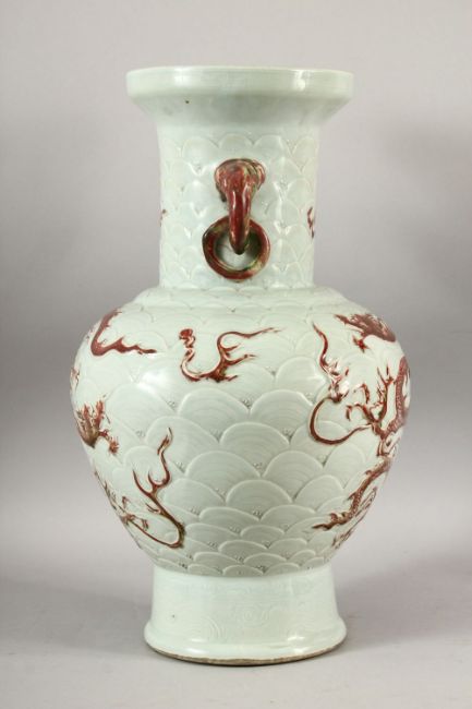 A CHINESE MNIG STYLE CELADON GLAZED CARVED PORCELAIN VASE - decorated with iron red dragons amongst celadon waves, the handles of elephant head form with rings, 47.5cm high.