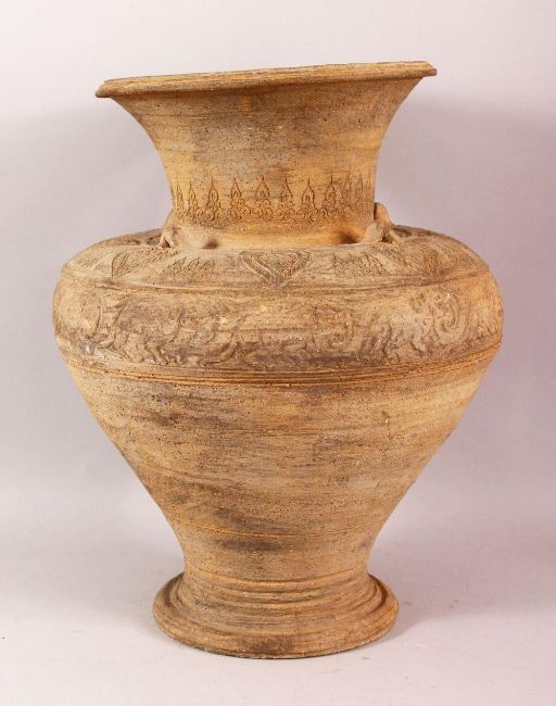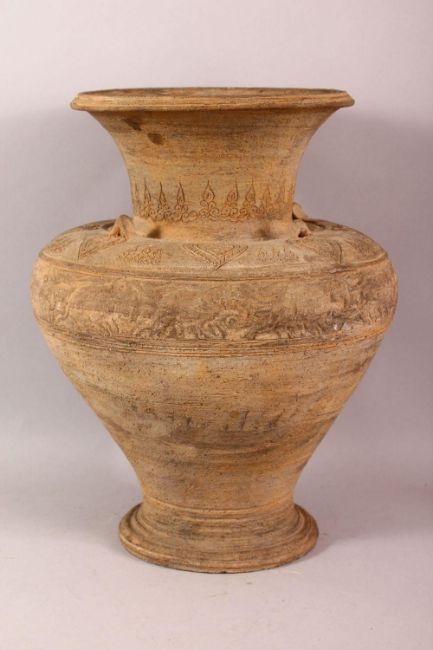 A LARGE EARLY ISLAMIC POTTERY VASE, the body with relief band of elephants, 37cm high.