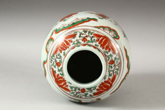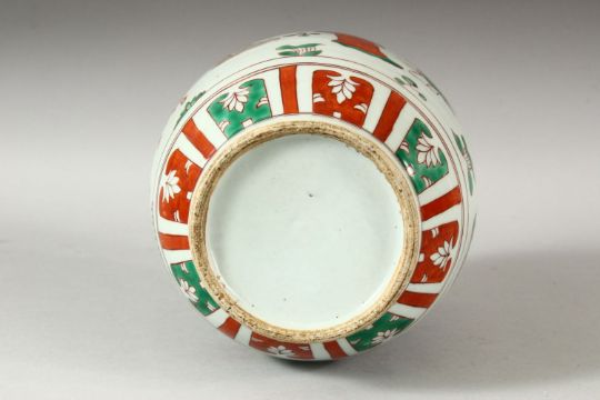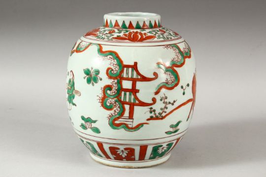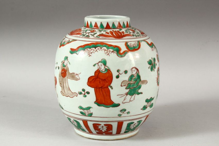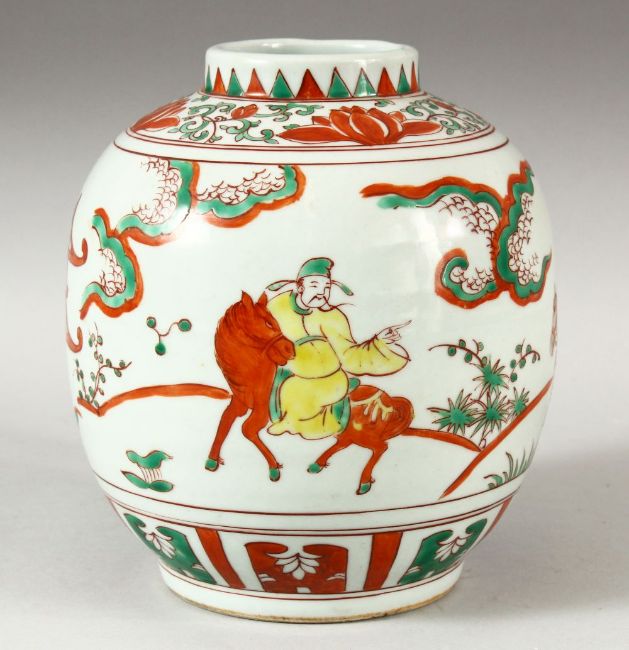 A CHINESE WUCAI DECORATED PORCELAIN GINGER JAR - decorated with scholars upon horseback and others stood in landscape settings, 19cm high