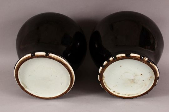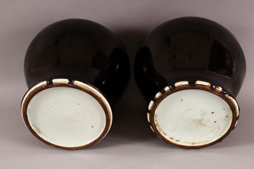 A PAIR OF CHINESE FAMILLE NOIR PORCELAIN GINGER JARS & COVERS, 30cm