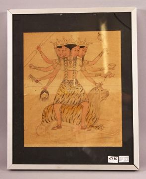A 19TH CENTURY INDIAN PAINTING ON PAPER OF KALI sat upon a tiger, framed and glazed, 31cm x 25.5cm overall.