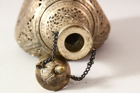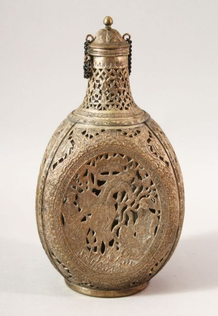 A PERSIAN OPENWORK LIDDED DECANTER, with carved panels of figures 25cm