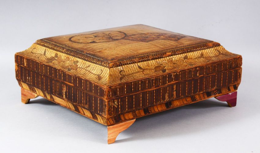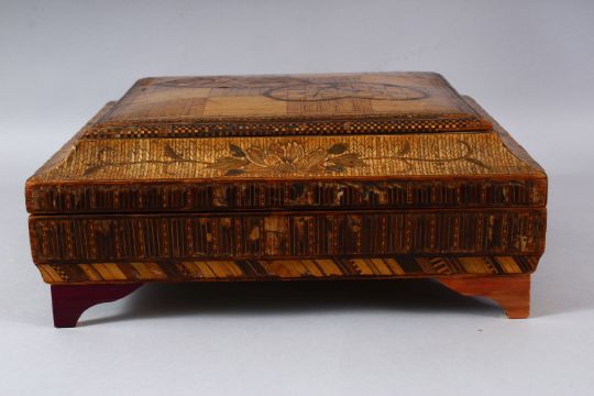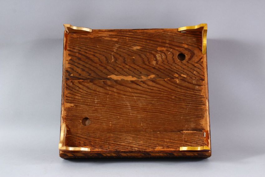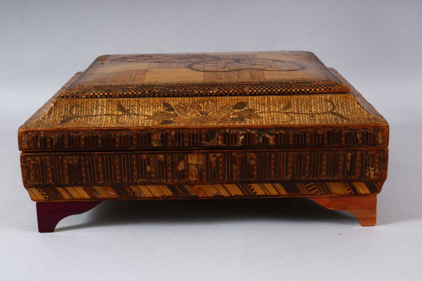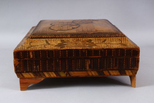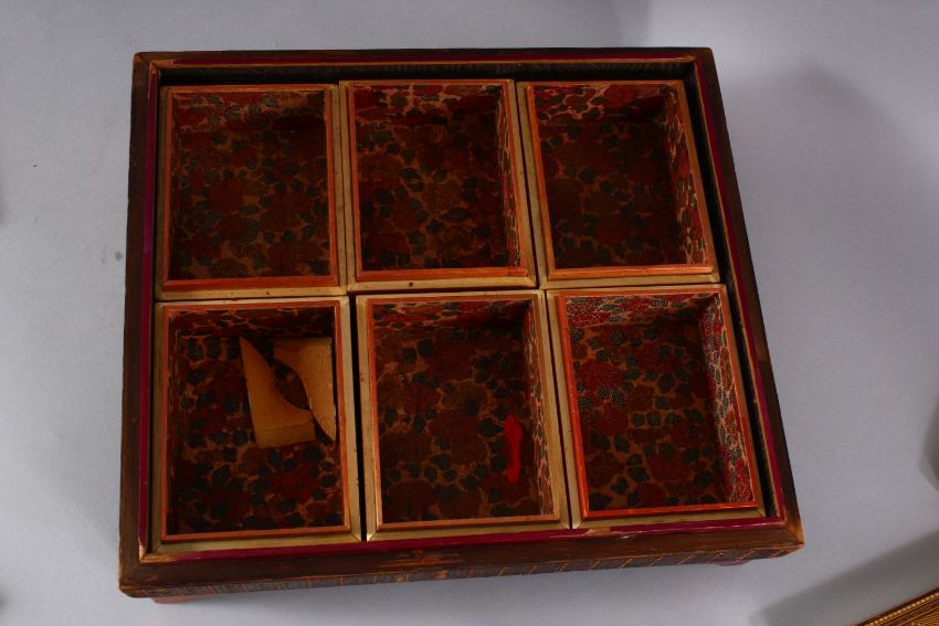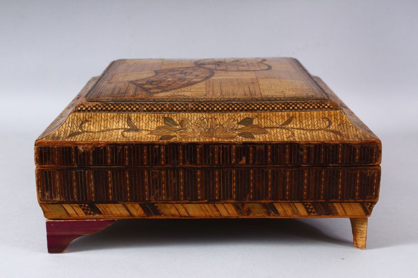 A GOOD EARLY 20TH CENTURY JAPANESE STRAW WORK LIDDED BOX, inlaid cover enclosing six rectangular boxes and cover with geometric inlay, 33cm wide.