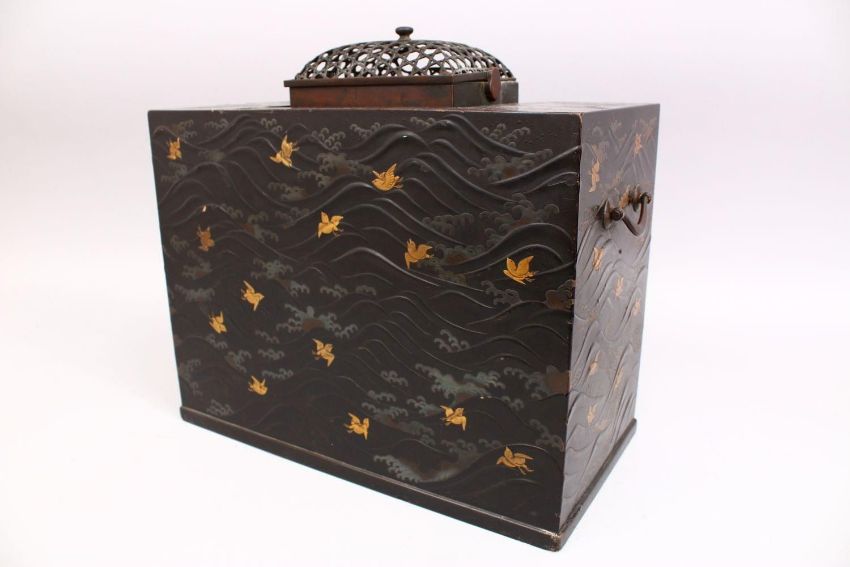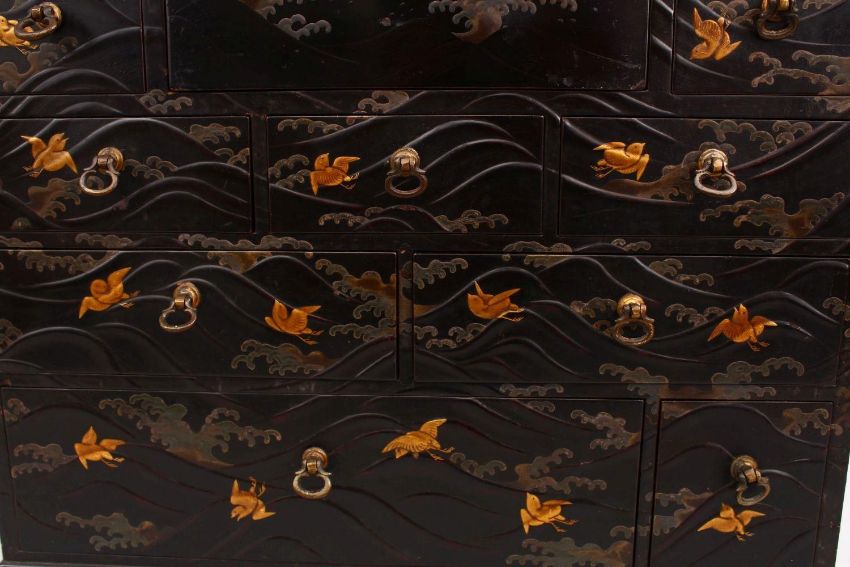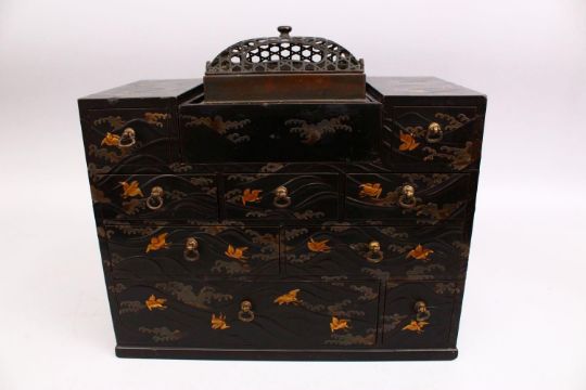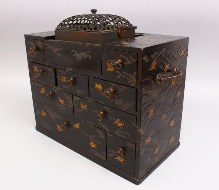 A GOOD JAPANESE MEIJI PERIOD LACQUER CABINET / BOX, The body decorated with raised wave design and gilt birds, the top with koro section, with 9 drawers, 34cm x 37cm.