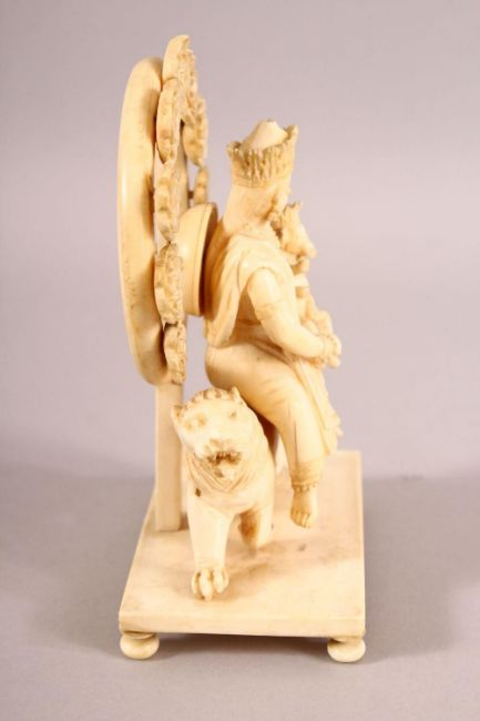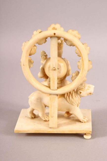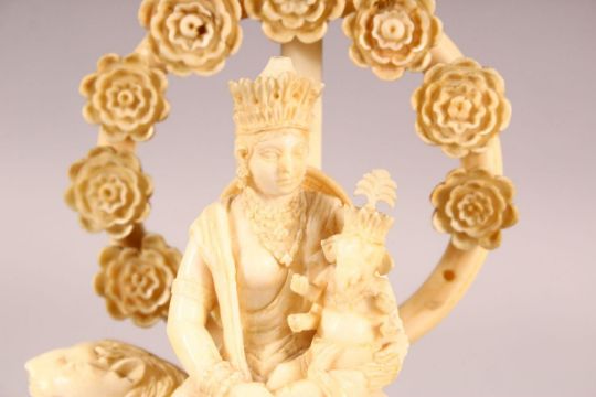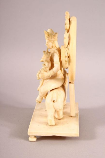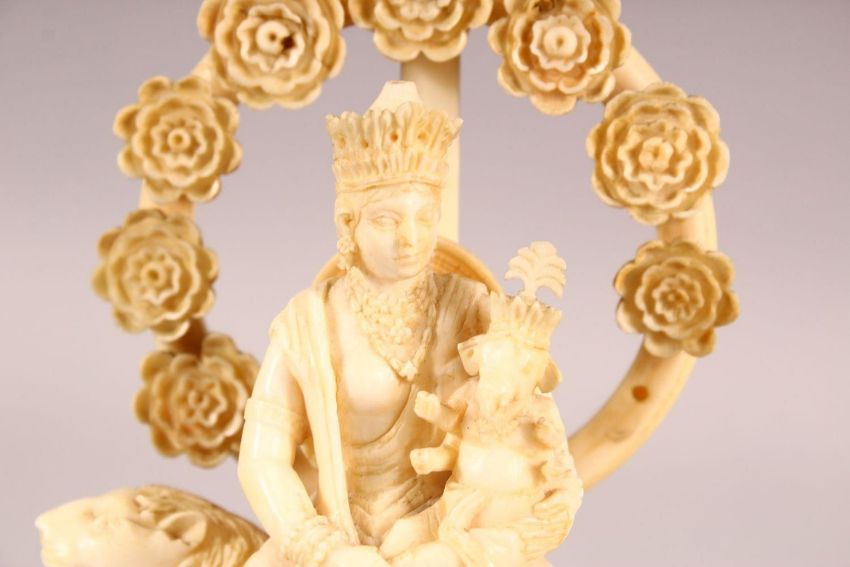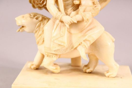 A FINE 19TH CENTURY CARVED IVORY FIGURE OF GODDESS PARVATI HOLDING GANESH, sat upon a lion on a rectangular base, the base with three ball feet (lacking one), 14cm high.