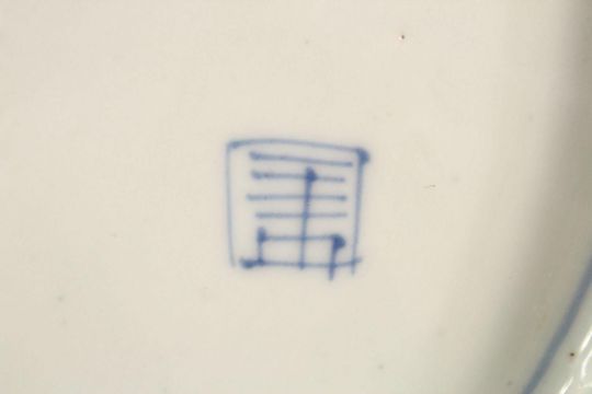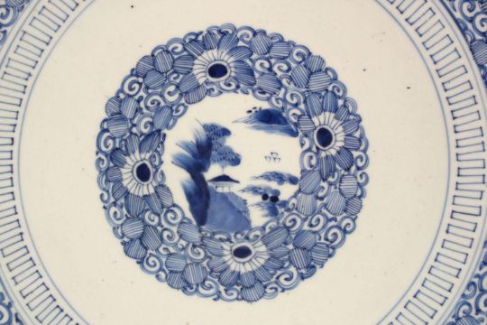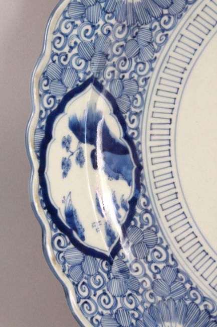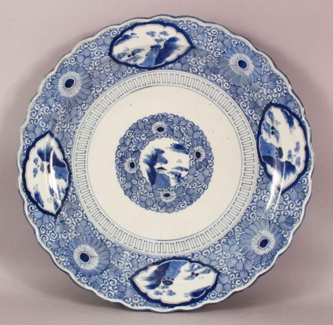 A LARGE JAPANESE MEIJI PERIOD BLUE & WHITE PORCELAIN CHARGER - decorated with central landscape panel- further decorated with landscape panels with a ground of scrolling flora, the base with a stylized seal, 46.5cm diameter.