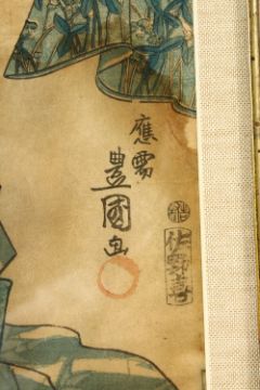 A JAPANESE WOODBLOCK PRINT, depicting a kneeling female figure applying her makeup, image 35cm x 23cm.