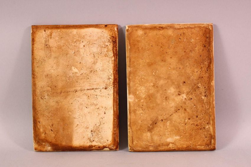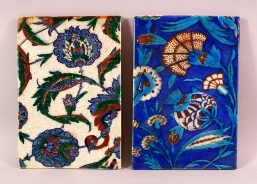 TWO IZNIK STYLE POTTERY TILES, with blue and white grounds with floral decoration, 23.5cm x 26cm.
