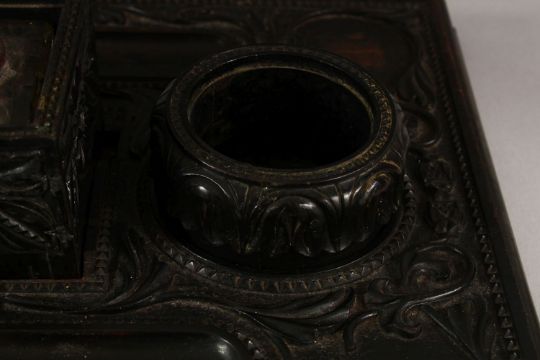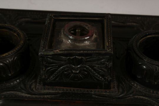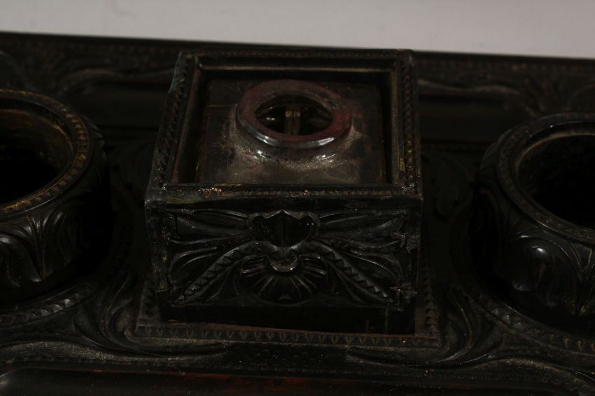 A 19TH CENTURY SRI LANKAN OR CEYLONESE CARVED EBONY DOUBLE SIDE DESK STAND, with cut glass central inkwell, 36cm wide.