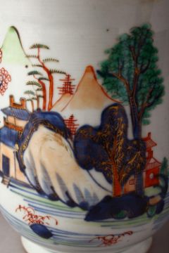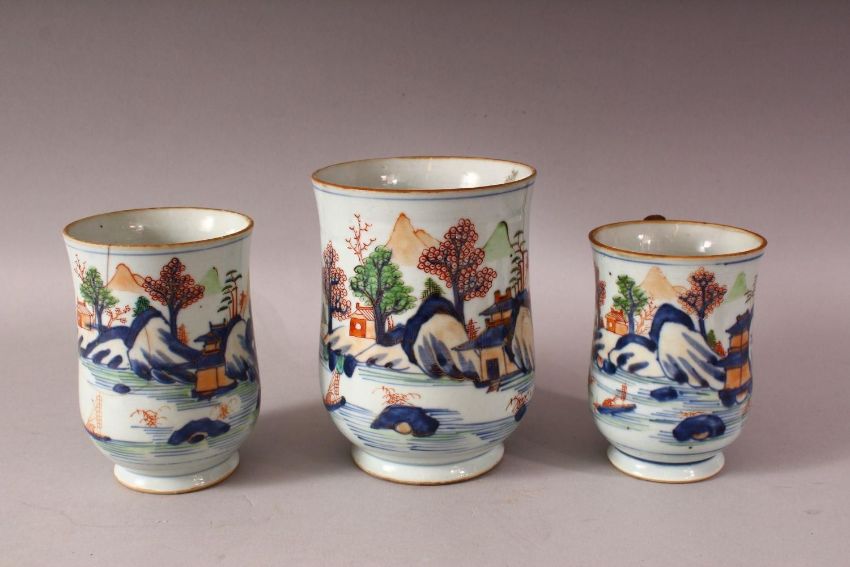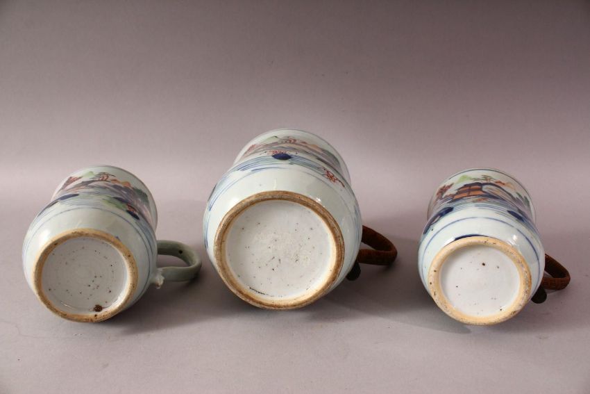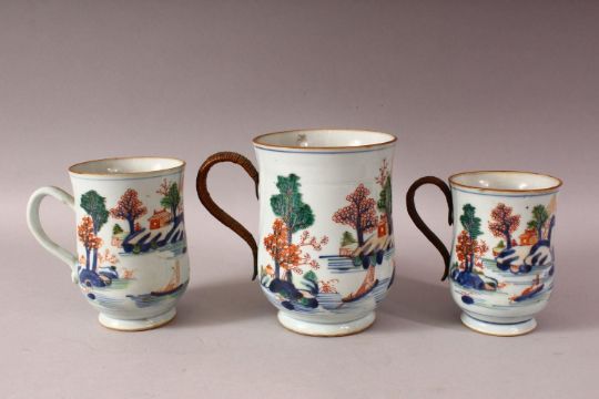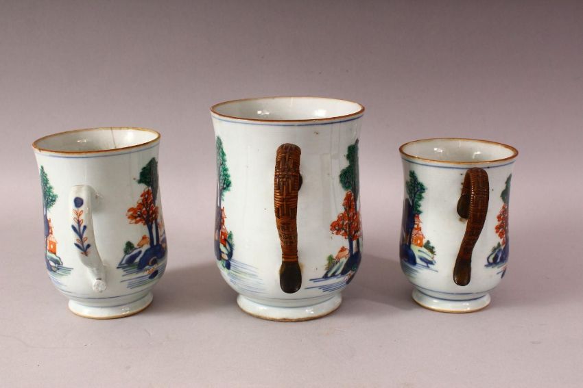THREE 18TH CENTURY CHINESE IMARI PORCELAIN TANKARDS - each decorated in a similar style depicting native landscape scenes - small medium and large, two with bamboo style woven handles, the other porcelain. 15.5cm , 13.5cm & 12,5cm (3)