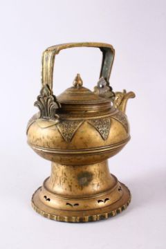 A CHINESE TIBETAN BRASS KETTLE & COVER, of tapered form with panel foliage motif, 26cm high x 24cm