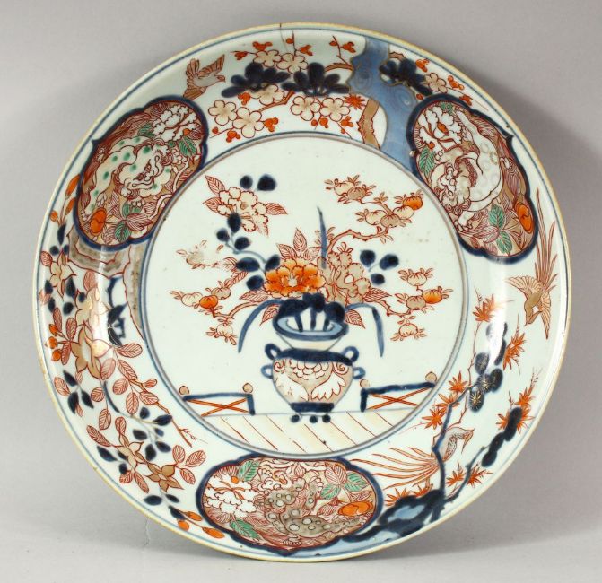 A JAPANESE IMARI / ARITA PORCELAIN DISH, painted with a vase and flowers, the border with lion dogs, 30.5cm.