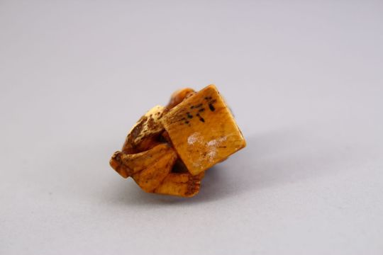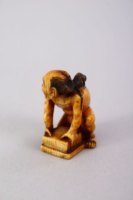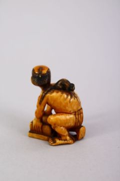 A JAPANESE MEIJI PERIOD CARVED IVORY SMALL OKIMONO OF A RAT CATCHER, the man leaning over his trap with the rat upon his back, himotoshi naturally formed at base. 3.5cm