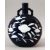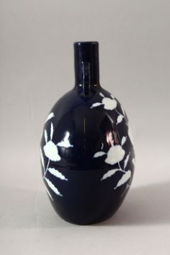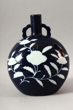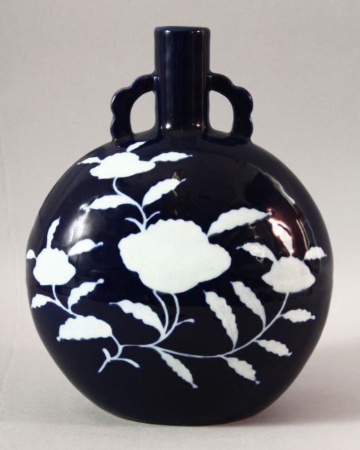 A CHINESE BLUE GLAZED TWIN HANDLE MOONFLASK, the body decorated with flowers in white, 28cm high.