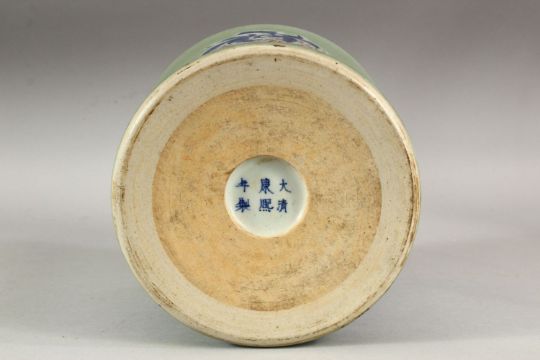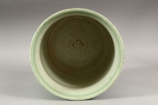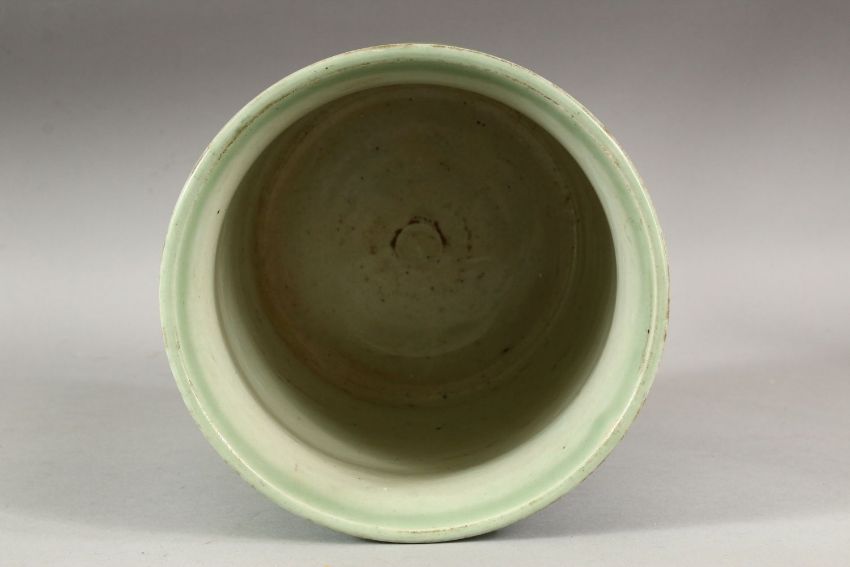 A LARGE CHINESE CELADON GLAZED BRUSH POT, the decorated with peaches, flora and forna, 17cm high, 19cm diameter.
