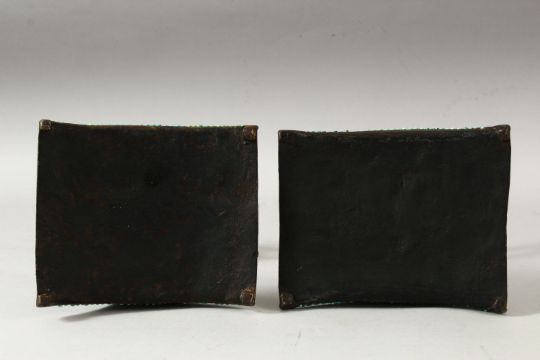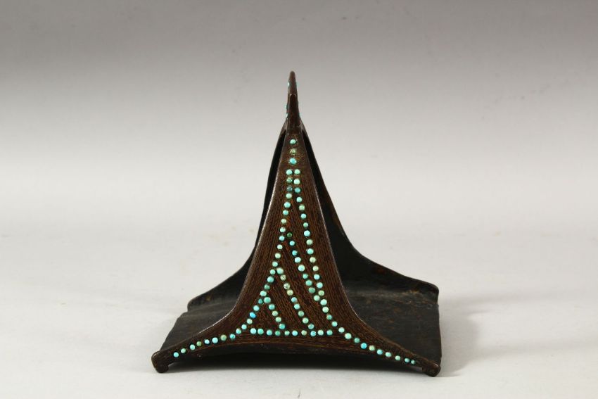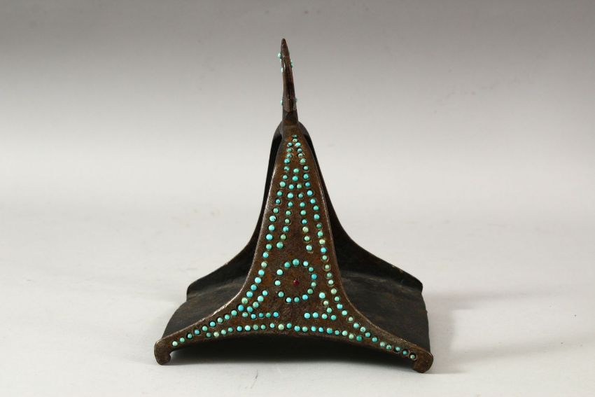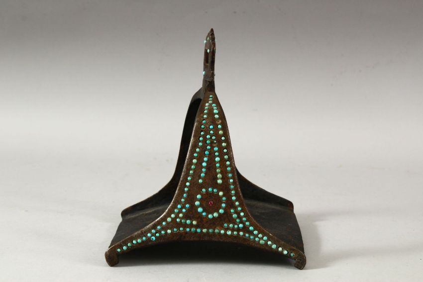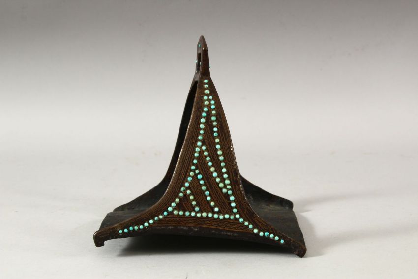 A MATCHED PAIR OF 18TH/19TH CENTURY PERSIAN OR OTTOMAN STEEL STIRRUPS, inset with turquoise beads.