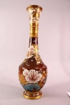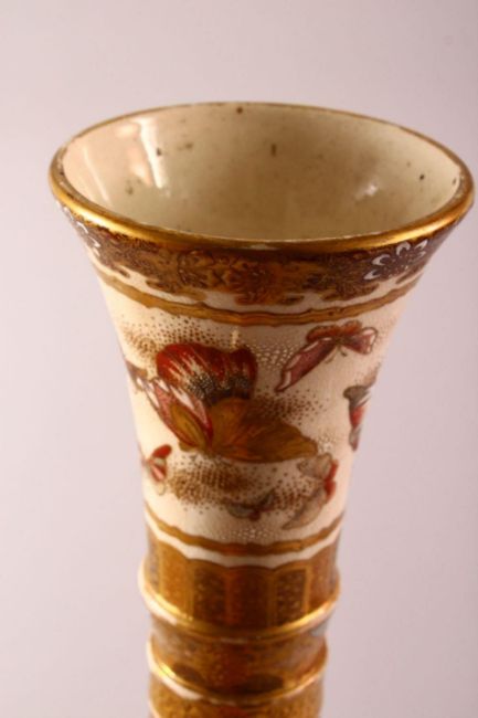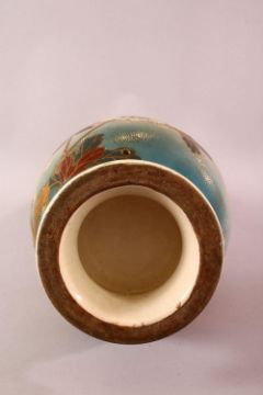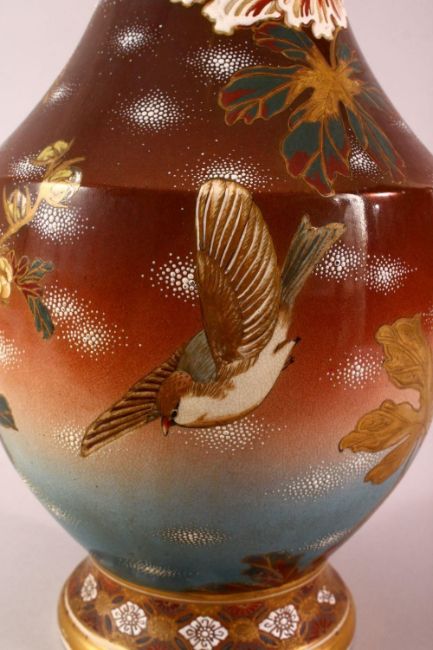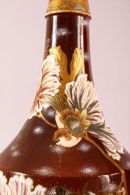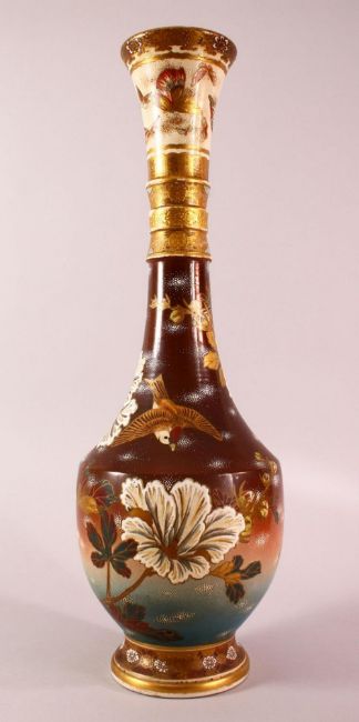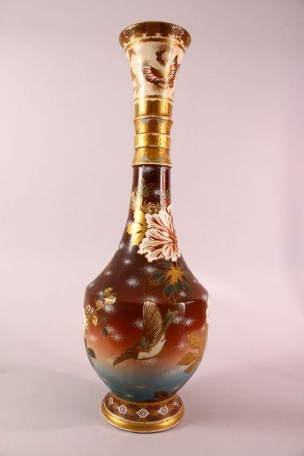 A LARGE JAPANESE MEIJI PERIOD MORIAGE SATSUMA VASE - the large long necked vase decorated with scenes of birds in flight amongst native floral landscape, the neck with butterfly pattern, 62cm high.