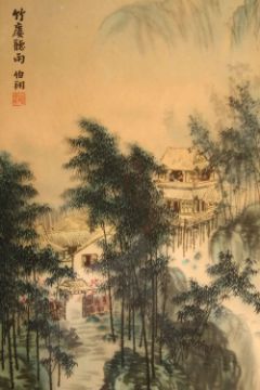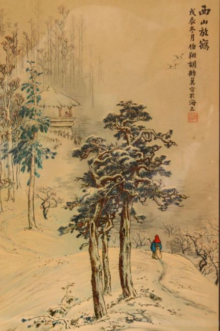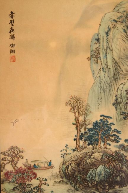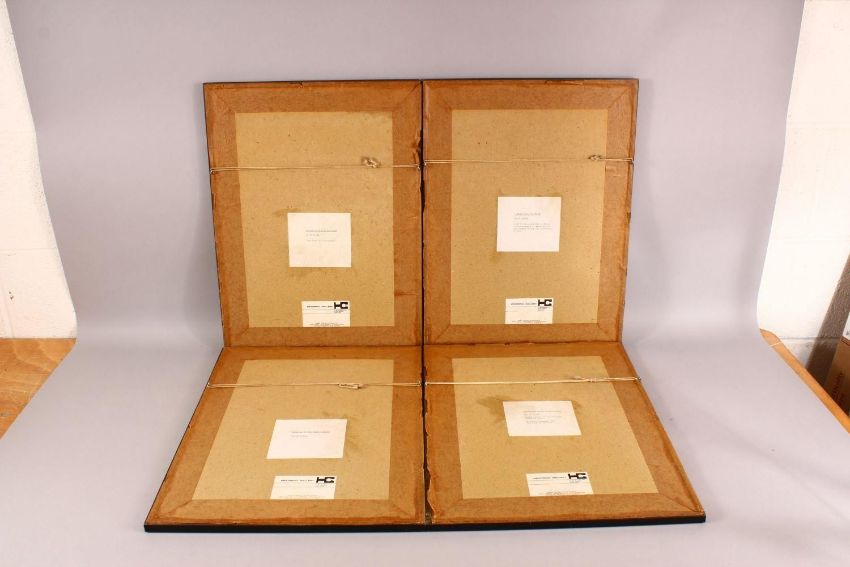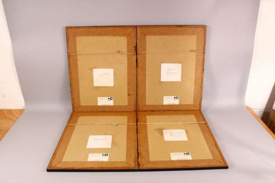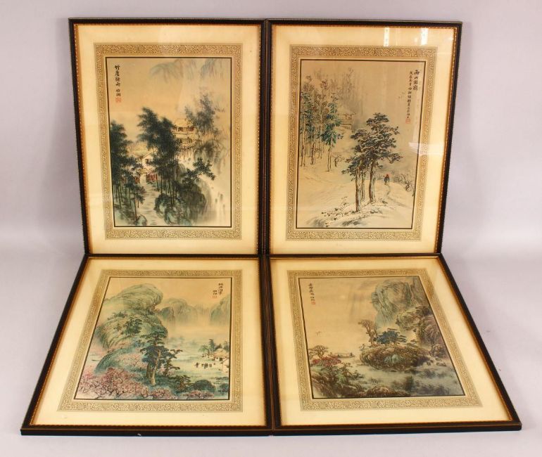 A SET OF FOUR CHINESE FRAMED PRINTS BY BO XIANG - "Paying a visit to Tao Yuan" - " Releasing birds at west hill" - " a nights tour to Chi Bi " - " raining by the bamboo ", 50cm x 38cm