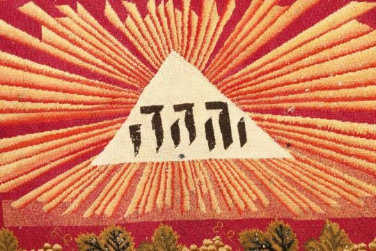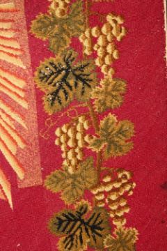A LARGE JEWISH TAPESTRY RUG / RUNNER, the centre with a judaica script, with grape and vine borders, 175cm x 63cm