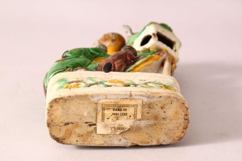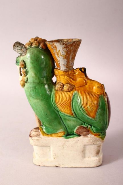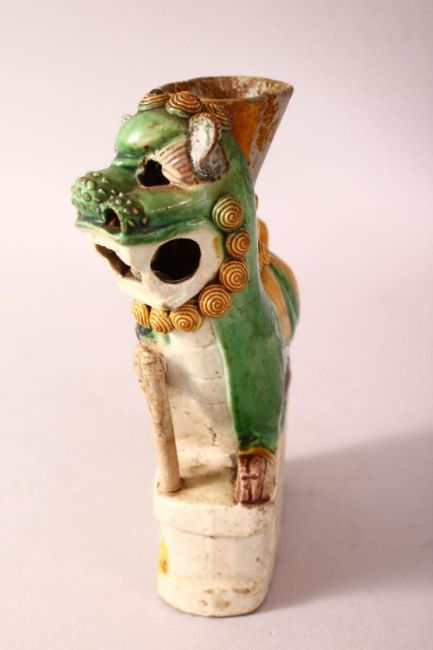 A 19TH CENTURY CHINESE SANCAI STYLE GLAZED LION DOG CANDLESTICK - in the form of a lion dog upon a pedestal, (AF)