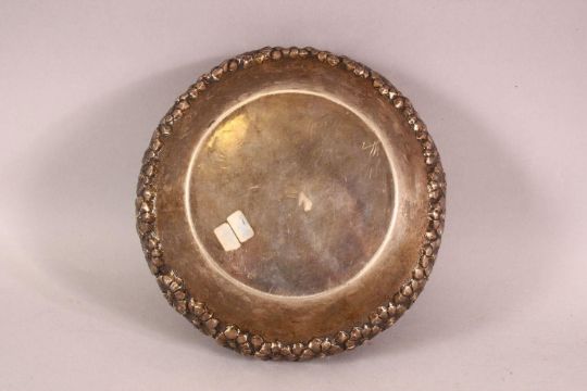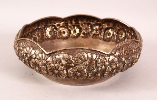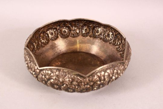 AN INDIAN SILVER BOWL, with embossed and chased floral decoration, 18cm diameter.