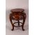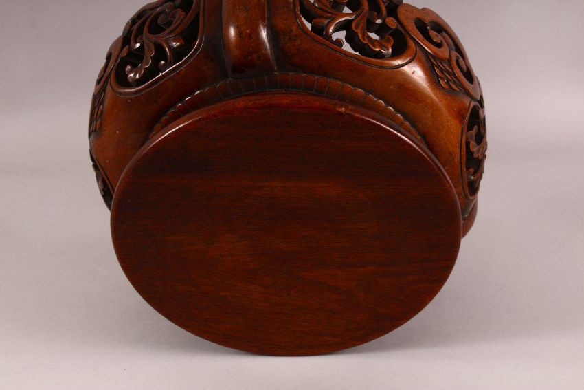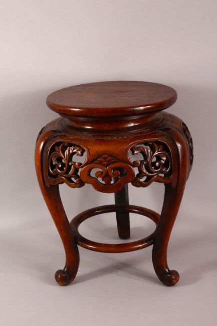 A JAPANESE CARVED HARDWOOD TRIPOD STAND - with a carved frieze of floral form, housing a vase or object no greater than 23cm, the table 35cm high