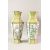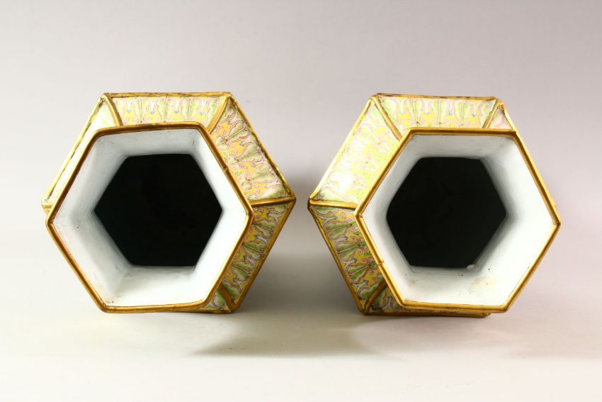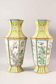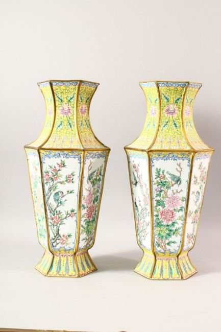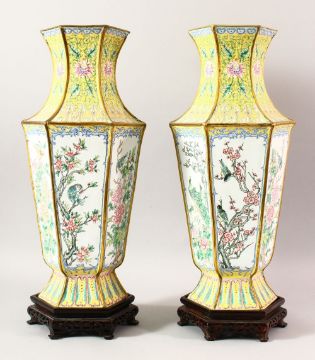 A LARGE PAIR OF CHINESE ENAMEL VASES & STANDS, the vases decorated upon a yellow ground with panels of birds in trees, each vase accompanied with a carved wood stand, 47cm high ( vases alone )