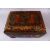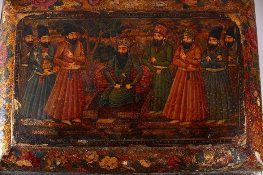 A GOOD PERSIAN QAJAR LACQUER PAINTED LIDDED BOX, decorated to the exterior with birds and detailed sprays of native flora, the lid decorated with gold spray and flora with a central painting depicting figures with gifts to a noble figure, the underside of the lid again finely painted with a panel depicting noblemen upon horseback attacking tigers, 28cm x 42cm x 28cm deep.