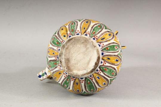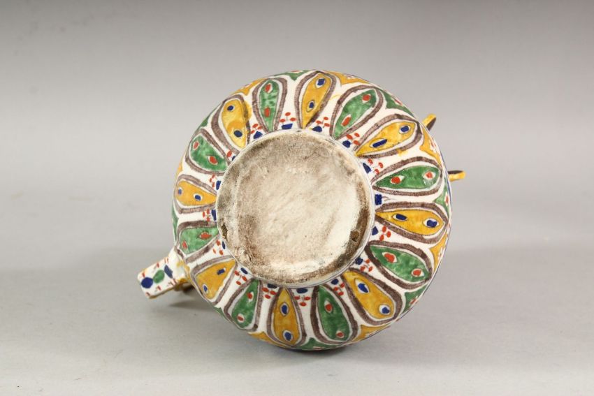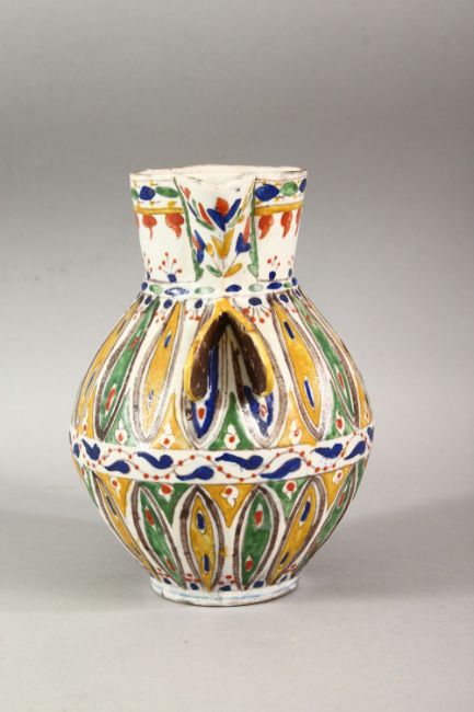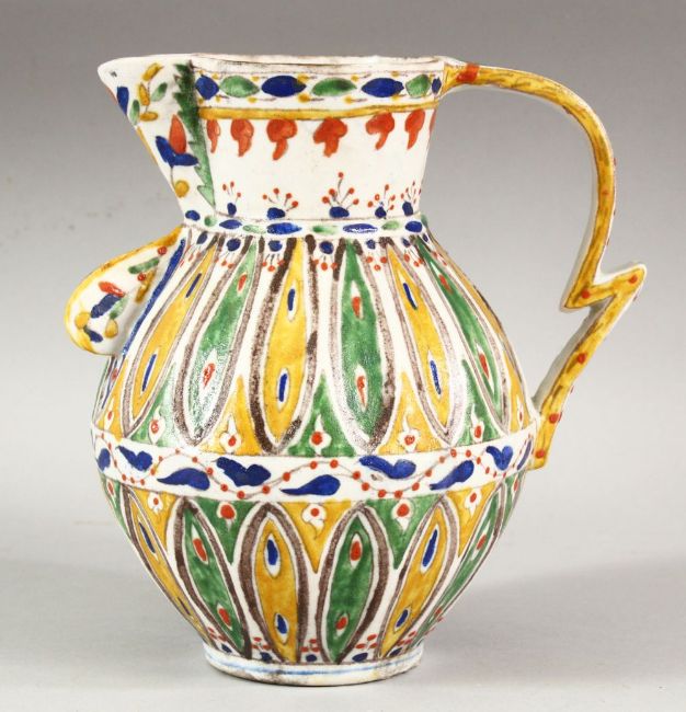 A TURKISH OTTOMAN KUTAHYA POTTERY POT - the body with multi coloured leaf shaped tendril with a geometric handle and spout 19cm