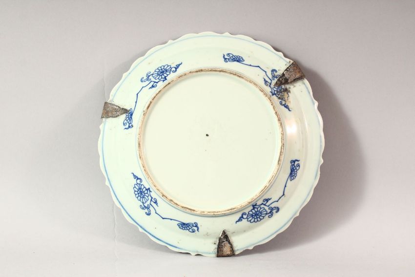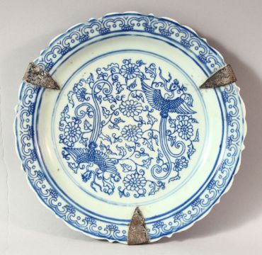A CHINESE BLUE AND WHITE PORCELAIN DISH, the centre decorated with phoenix amongst flowers, 23cm diameter.