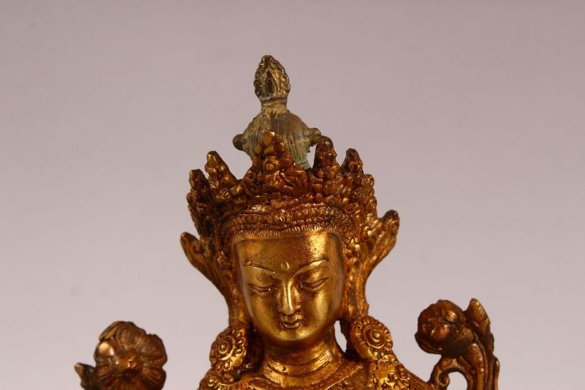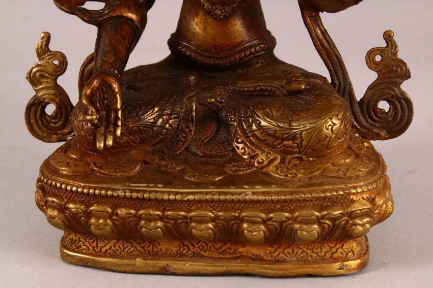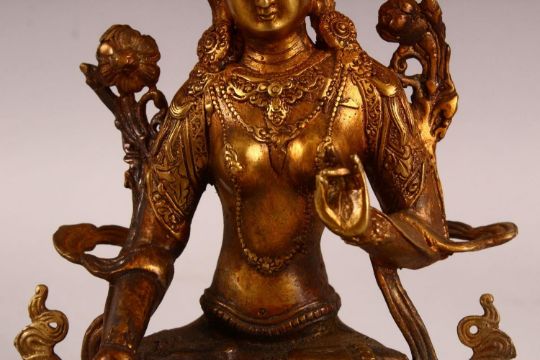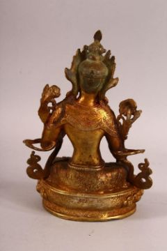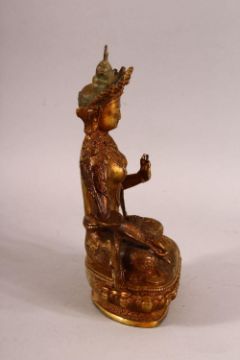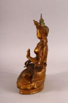 A CHINESE TIBETAN GILT BRONZE FIGURE OF A DEITY - in a seated mudra pose, the base wwith an impressed mark. 20cm