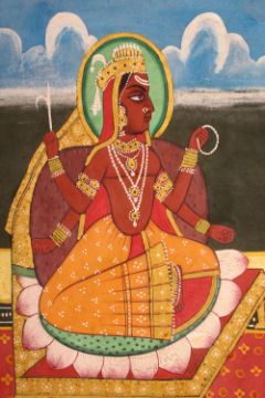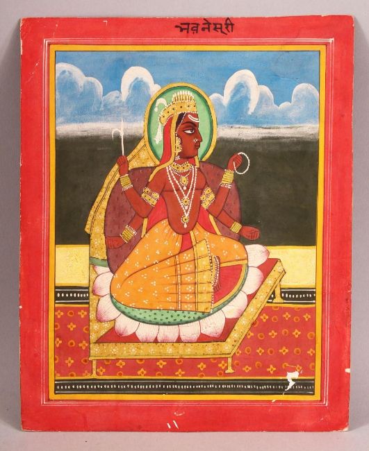 AN INDIAN MINIATURE PAINTING OF A HINDU DEITY, inscription to the top, unframed, 25cm x 20cm.