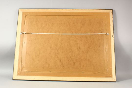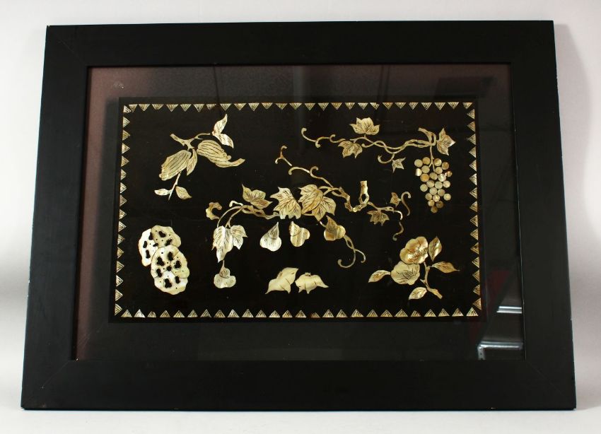 A CHINESE DECORATIVE LACQUER PANEL INLAID WITH MOTHER OF PEARL, depicting various fruits and blossom, framed and glazed, panel 30cm x 46cm.
