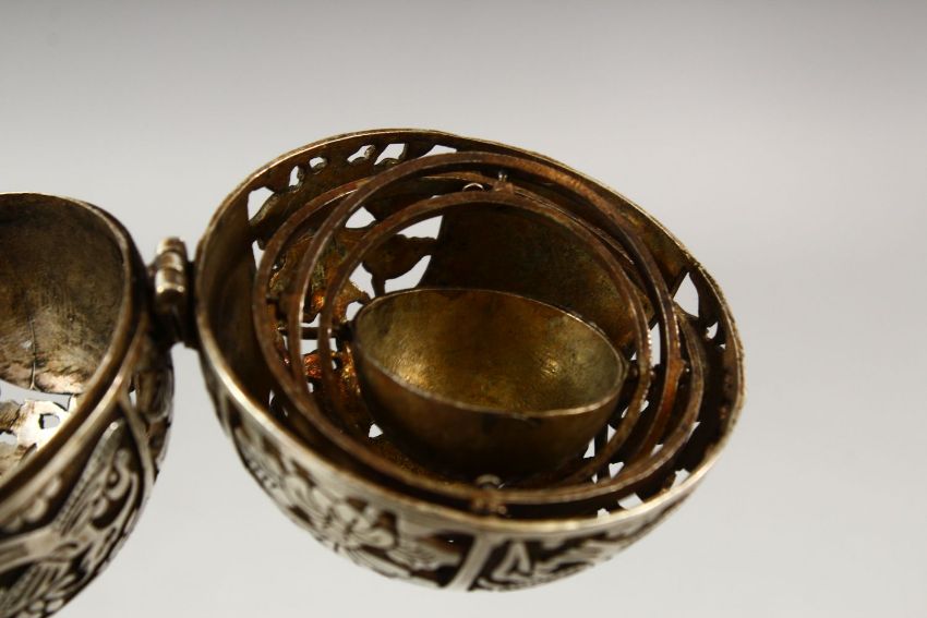A CHINESE WHITE METAL / POSSIBLY SILVER SPHERICAL TRAVELLING INCENSE BURNER on chain, 5cm.