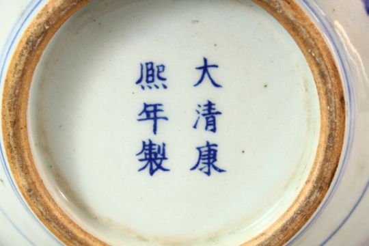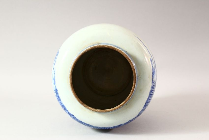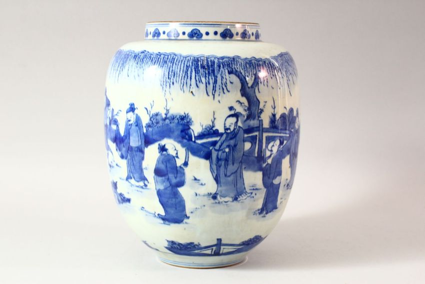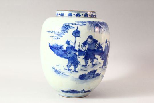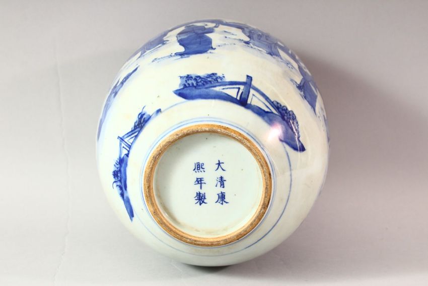 A CHINESE KANGXI STYLE BLUE AND WHITE LANTERN JAR, possibly republic, the body painted with figures in a landscape setting, 25.5cm high.