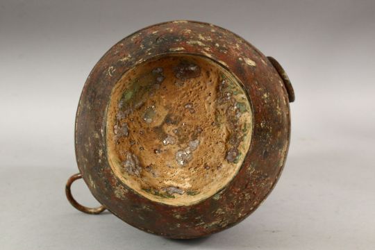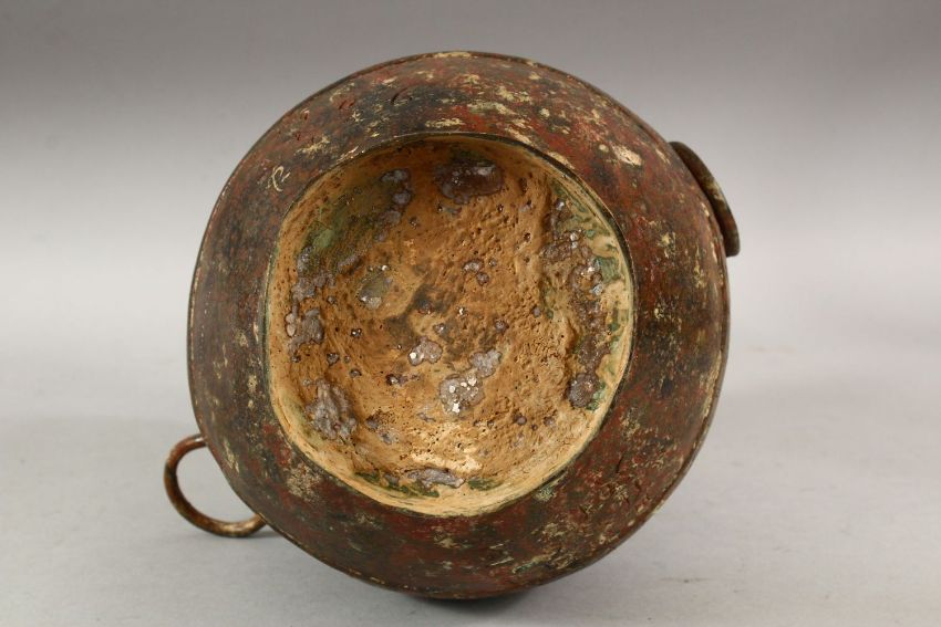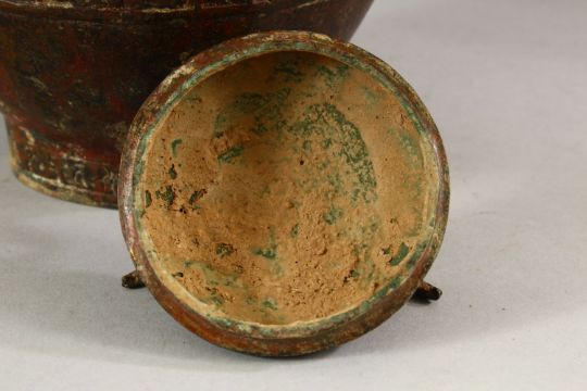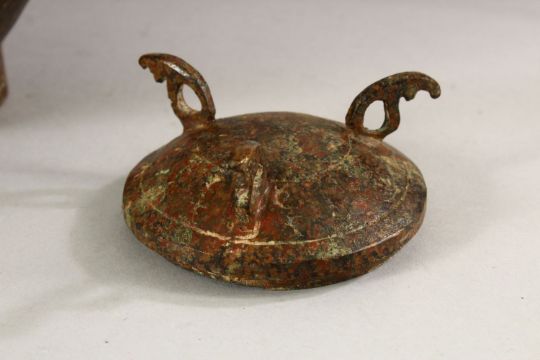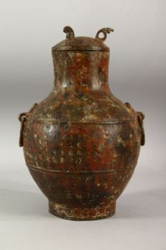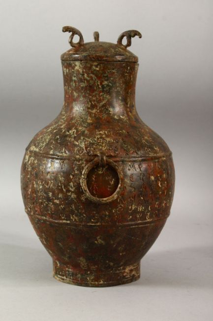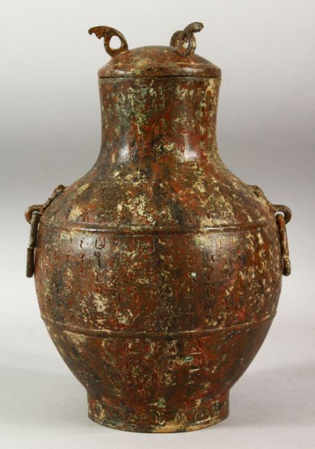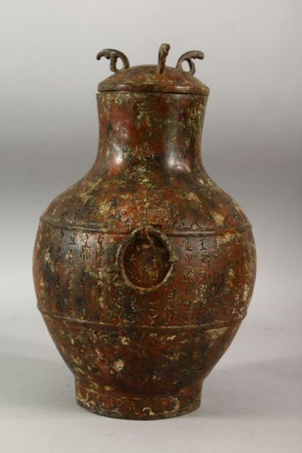 A CHINESE ARCHAIC STYLE BRONZE LIDDED TWIN HANDLE VESSEL, incised with calligraphy, 30cm high.