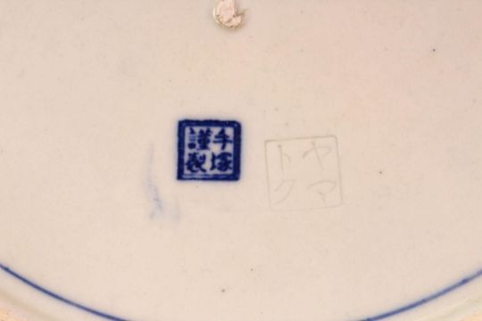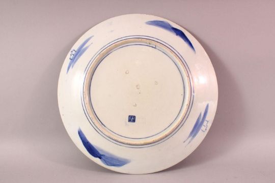 A JAPANESE BLUE & WHITE PORCELAIN PLATE, poss arita, decorated with a bird amongst lotus, the underside with a double seal mark, 37cm
