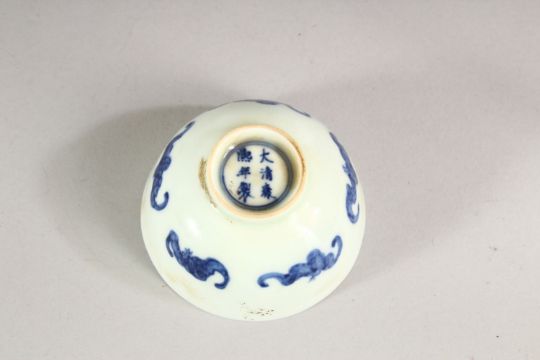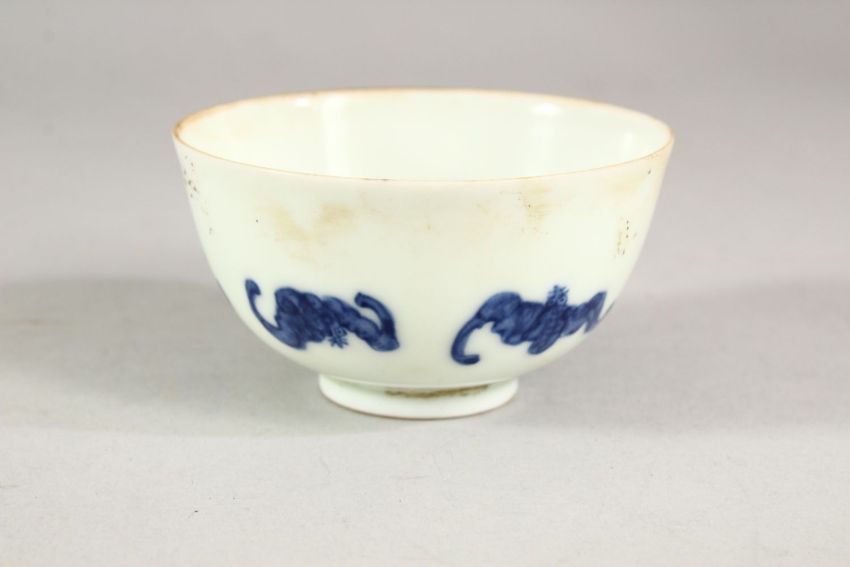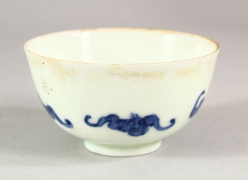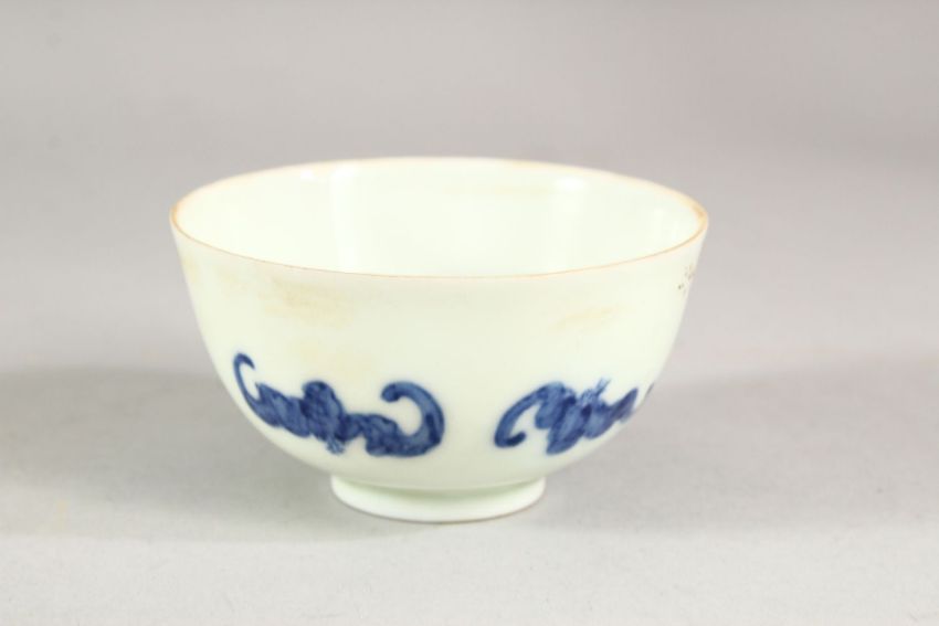 A CHINESE PORCELAIN TEA BOWL, painted in blue depicting bats, 8cm diameter.