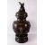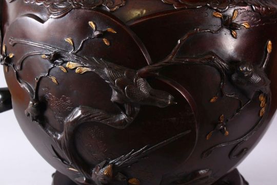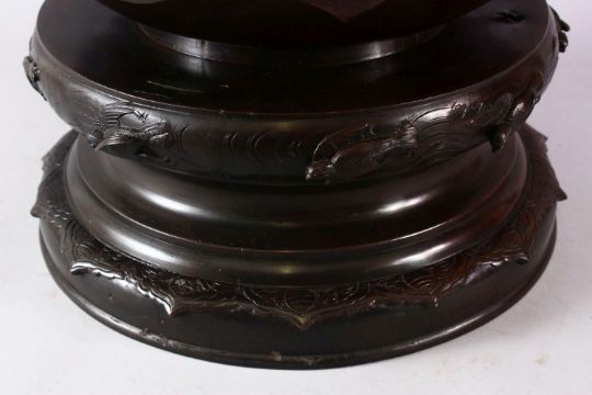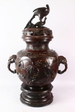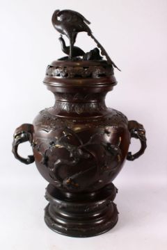 A JAPANESE MEIJI BRONZE RELIEF THREE PIECE VASE POS, the body with relief work of birds and flora with picked out gilt highlights, with a border of clouds, with twin elephant head mask handles, the cover with openwork clouds and two peacock figures ( one loose ), the base with relief bird decoration, 98cm high x 63cm wide.
