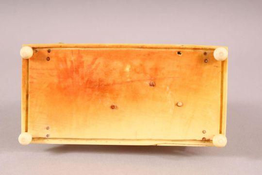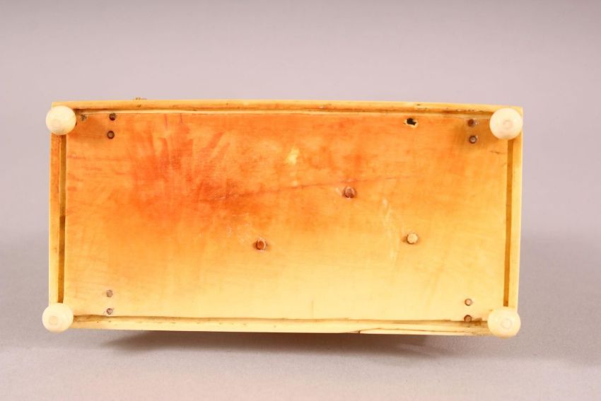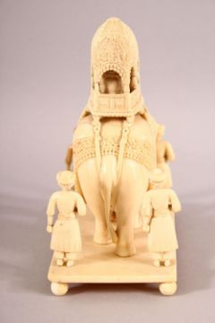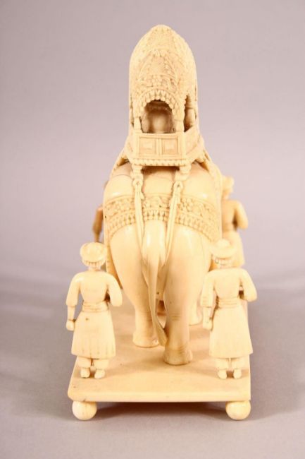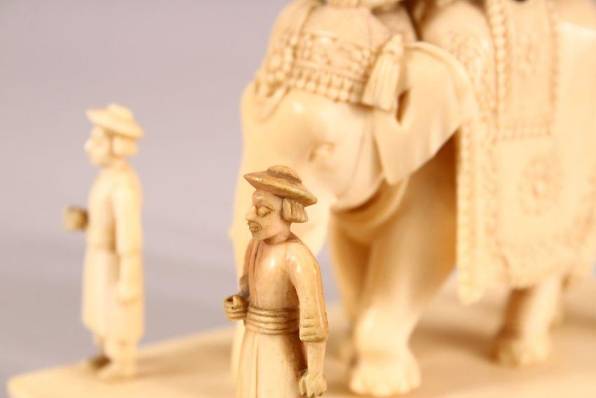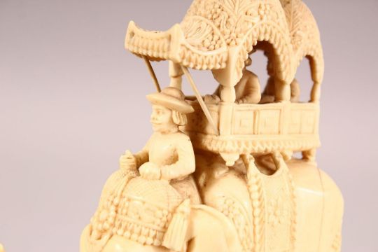 A FINE 19TH CENTURY INDIAN CARVED IVORY ELEPHANT GROUP, the elephant with covered howdah containing two figures, the elephant on a rectangular base along with four guards, 13cm high, the base 12.5cm x 6cm.