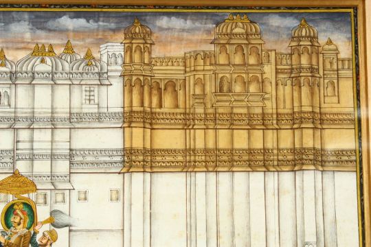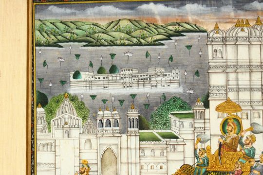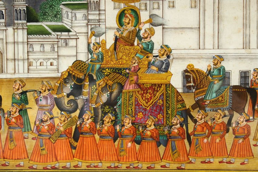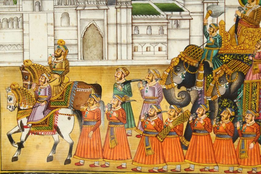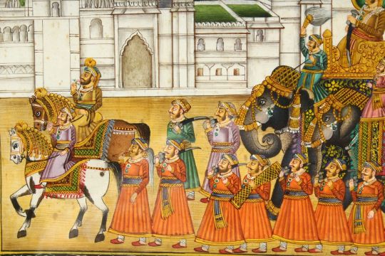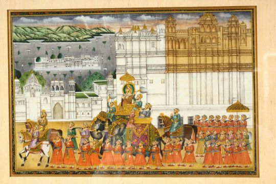 A GOOD INDIAN SCHOOL MINIATURE PAINTING depicting a colourful procession, image 26cm x 38cm.